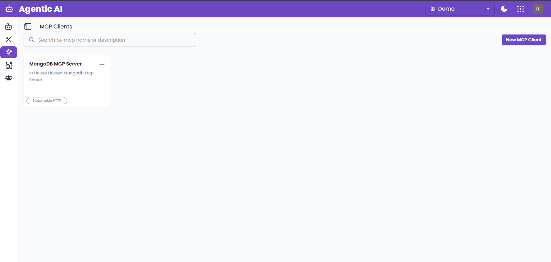 This page lists all MCP clients added for your organization. MCP (Model Context Protocol) is a standardized protocol for connecting AI models with various data sources and tools. Once MCP clients are created here, they can be used in agent workgroups for enhanced AI capabilities.